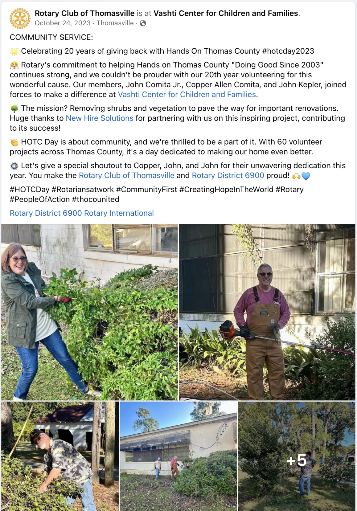 On October 24, 2023, we celebrated 20 years of giving back with Hands On Thomas County for their annual Hands on Thomas County Day (HOTC Day.) Rotary's commitment to helping Hands on Thomas County "Doing Good Since 2003" continues strong, and we couldn't be prouder with our 20th year volunteering for this wonderful cause.Our members, John Comita Jr., Copper Allen Comita, and John Kepler, joined forces to make a difference at Vashti Center for Children and Families.